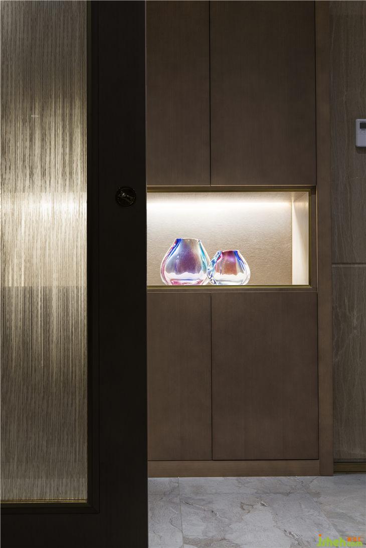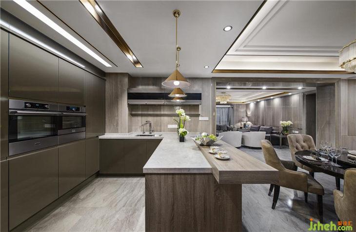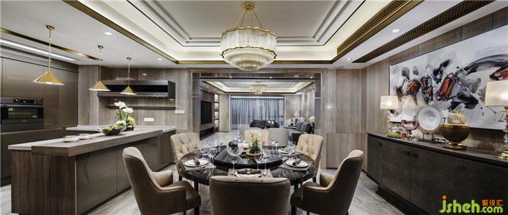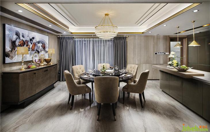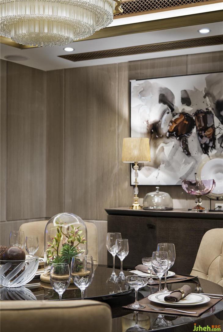 餐廳同樣延續(xù)客廳空間的顏色基調(diào),營造出貴族式的冷靜。如果說,港式輕奢是一種生活氣質(zhì),那么在這里,輕奢的表達更多見于顏色的冷處理之上。