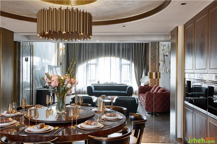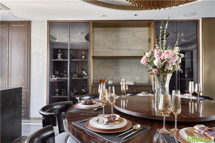 抬頭金屬吊燈的設(shè)計(jì),增強(qiáng)了空間的層次,讓整個空間立體起來。造型簡潔優(yōu)雅、木質(zhì)珍貴的promemoria的餐桌,搭配金屬質(zhì)感、弧形設(shè)計(jì)的餐椅,讓空間增添符合現(xiàn)代人審美的時尚質(zhì)感,并與周圍硬裝的空間塑造相呼應(yīng),軟硬裝和諧融合,成功的營造出莊重高貴的空間氣質(zhì)。質(zhì)地精致的高腳杯等餐具和鮮花元素的植入,使用餐環(huán)境變得美麗優(yōu)雅,讓用餐氛圍多了一份浪漫怡人。