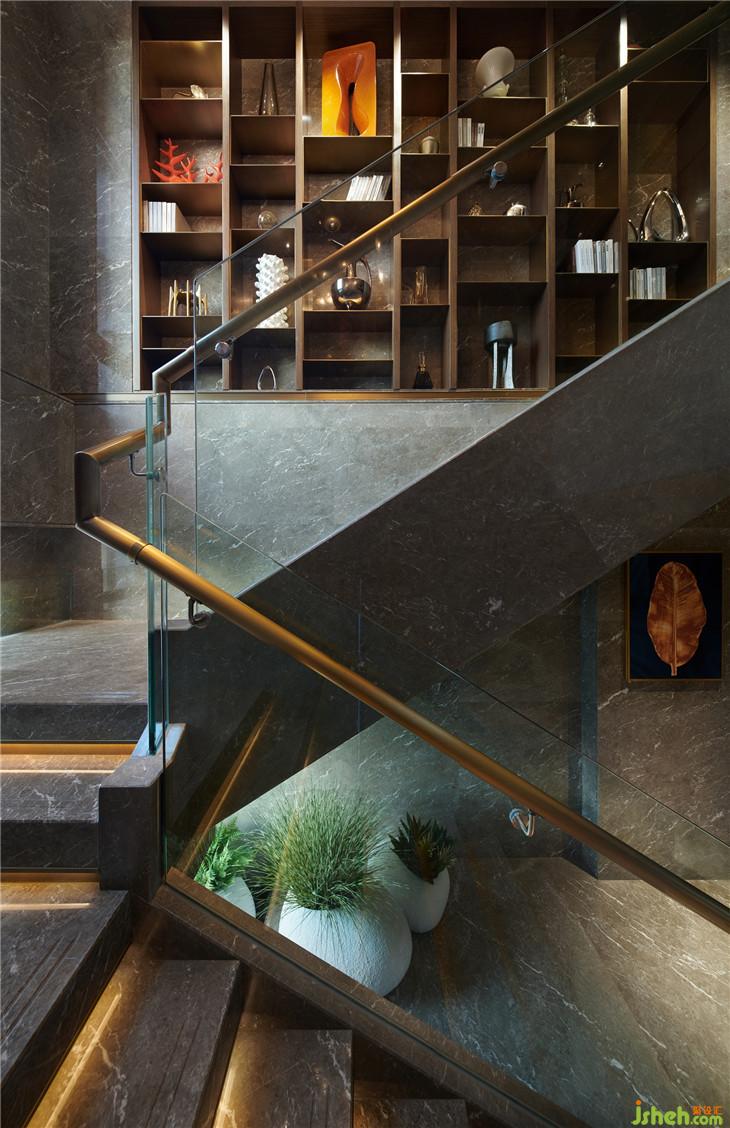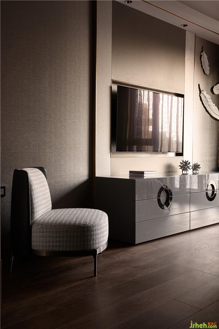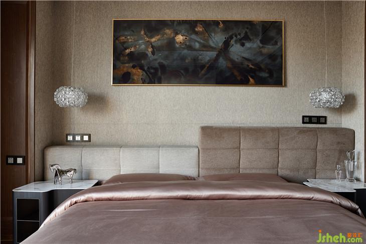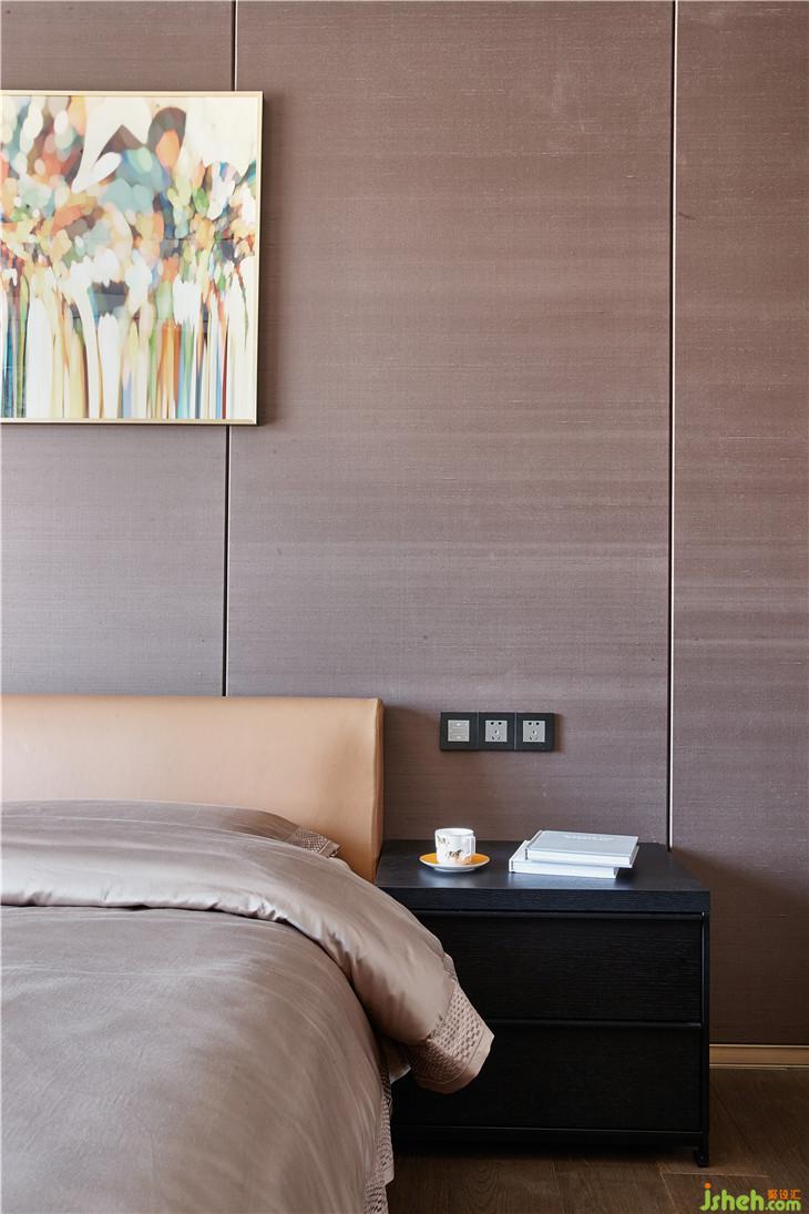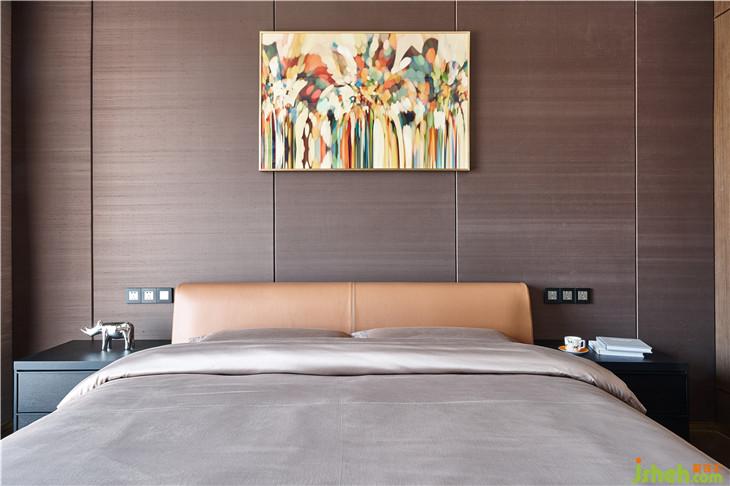 一層的客臥套間,設計師利用大面積的淺咖色硬包背景墻,與橙色的床背景做配搭,營造出一種典雅而不失時尚的空間氛圍,整個臥室氛圍便于安穩(wěn)睡眠。背景墻正中間,裝飾畫點綴其中,色彩絢爛、熱烈奔放,使得空間視覺效果更為豐富。