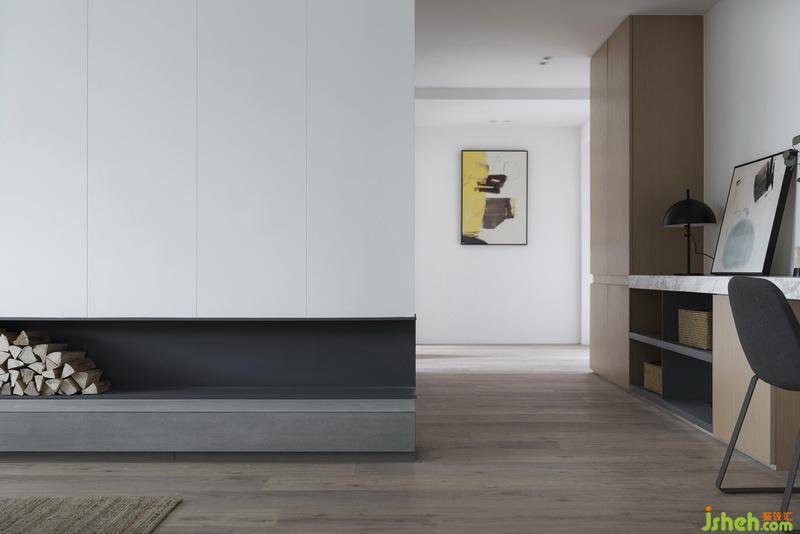 擴(kuò)寬尺度的走廊結(jié)合功能柜體更具空間美感,解決原始走廊的狹窄與單調(diào)。