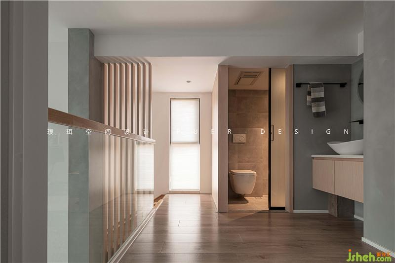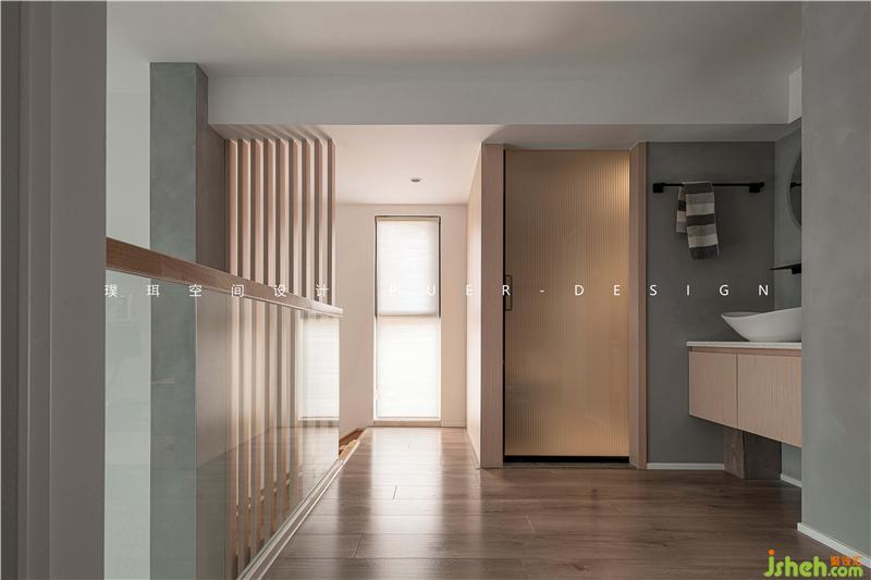 主臥與挑高區(qū)以玻璃為隔墻,延伸出空間通透的視覺感。