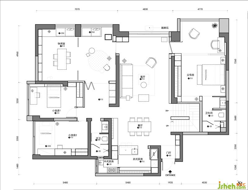 布局規(guī)劃出日常起居所需,將人情溫度加注在設(shè)計(jì)細(xì)節(jié),讓人在空間各處,實(shí)時(shí)體會(huì)到對人文精神的關(guān)懷體貼:玻璃移門阻隔中式廚房的油煙,便于清潔,煮婦煮夫的烹飪更加自由;客餐廳開放一體,做飯同時(shí)可以照看小孩;大餐桌承載三代人共享美食的天倫之樂。