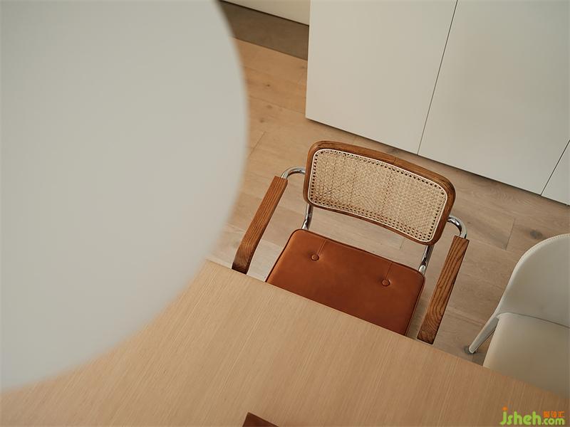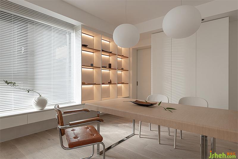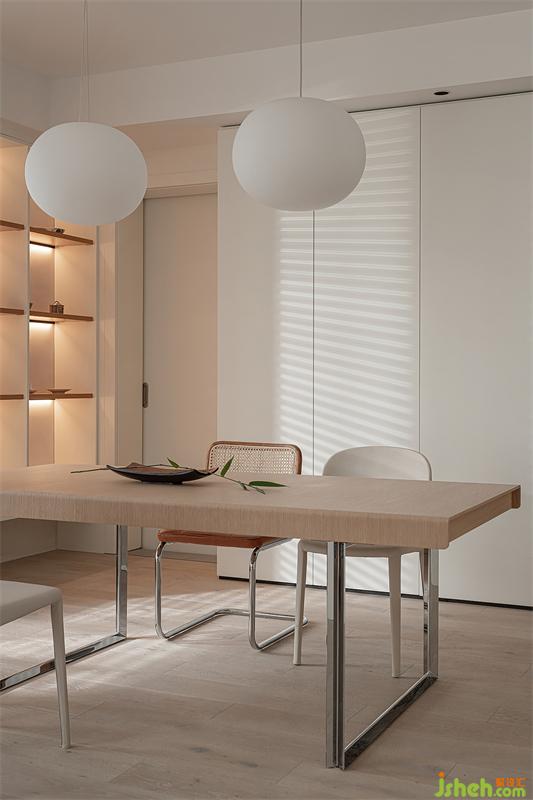 同時(shí),餐桌背后的墻面被利用來(lái)做收納空間,順便將廚房的門(mén)一并隱藏。