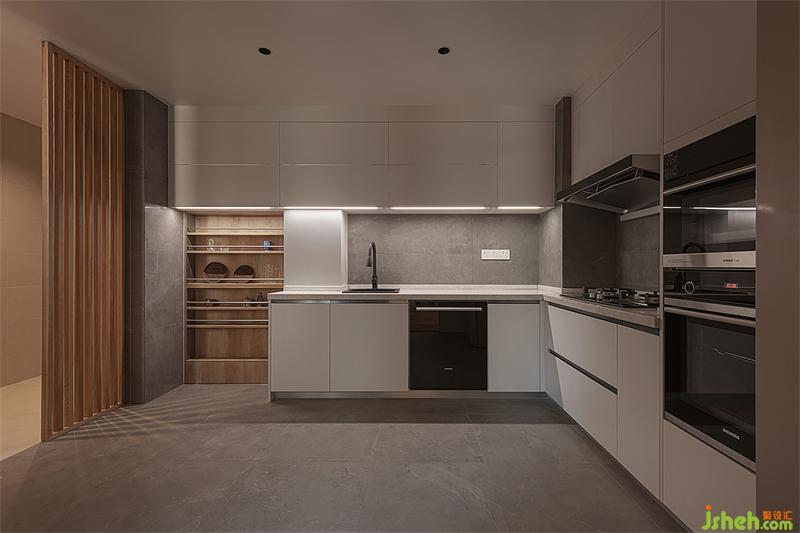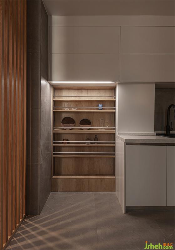 廚房將設(shè)備間面積縮小,廚房整體面積擴(kuò)大,盡可能將功能設(shè)施做到完備,再用木格柵做鏤空的隔斷,用光影為烹飪空間增添一絲興味。