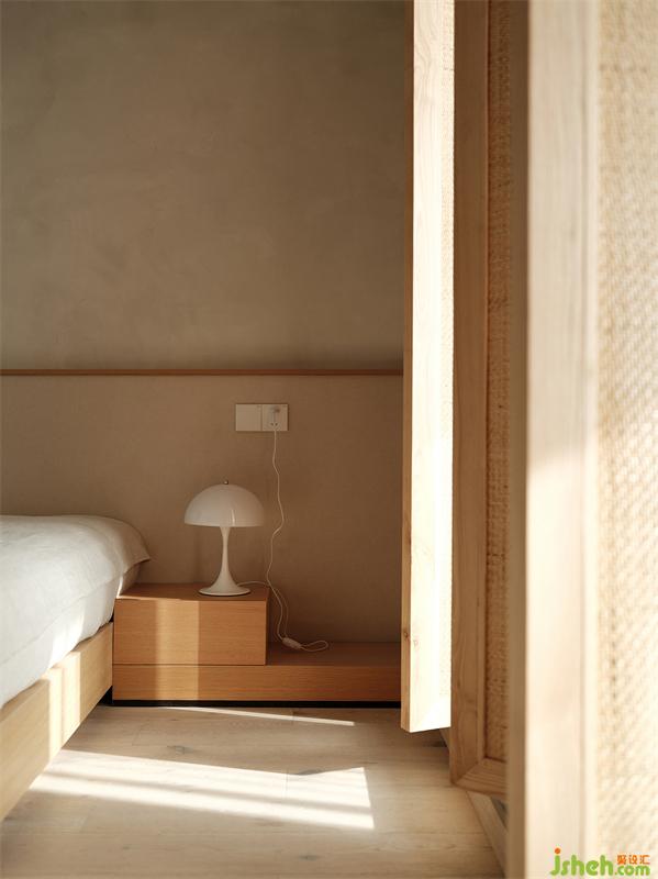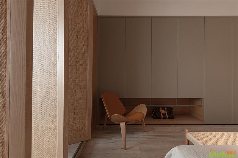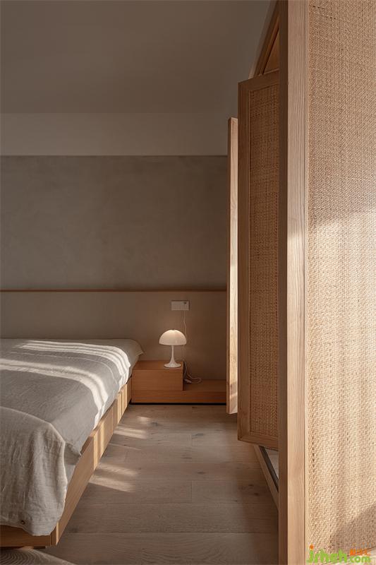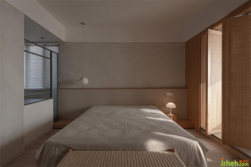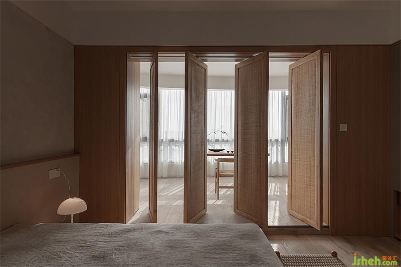 休閑陽(yáng)臺(tái)地面整體抬高與臥室內(nèi)部以屏風(fēng)移門(mén)相隔,合起移門(mén),可完全隔絕采光,營(yíng)造安穩(wěn)的睡眠空間;推開(kāi)移門(mén),臥室空間瞬間擴(kuò)大三分之一,開(kāi)闊而通透。