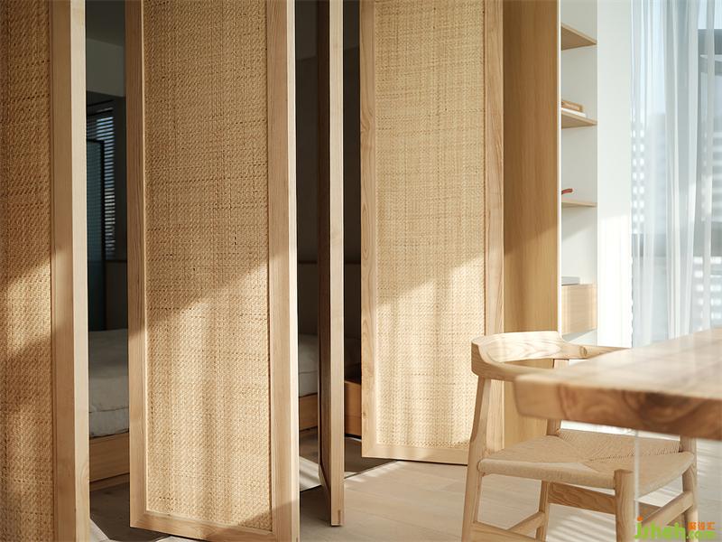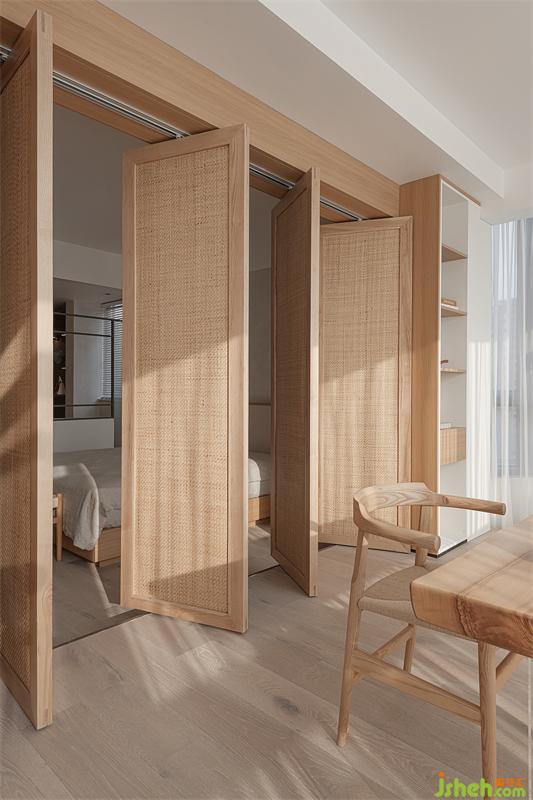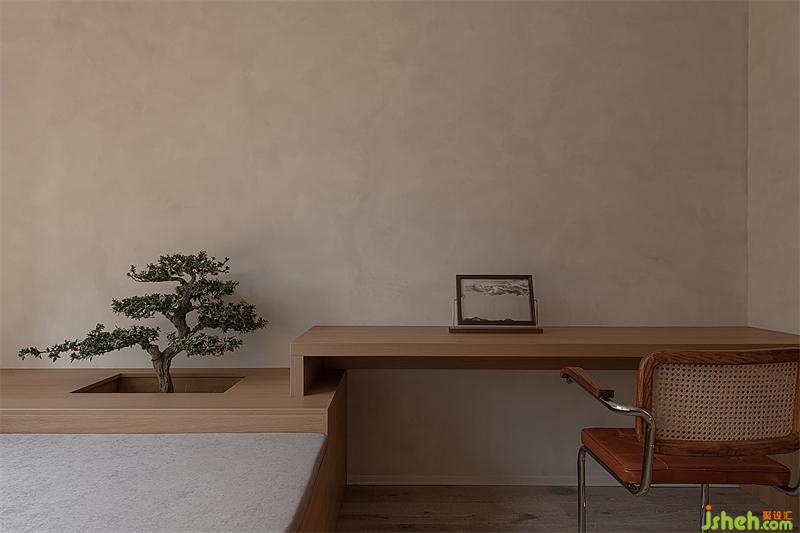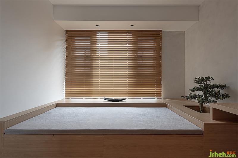 給喜靜的男業(yè)主一間獨(dú)立的書房用來辦公和冥想,簡(jiǎn)單到僅有:榻榻米、書桌、座椅,以及一片與書桌相連可以放書的木臺(tái),與其說木百葉掌控著室內(nèi)的明暗,不如說是他可以更游刃有余地與自我相處。