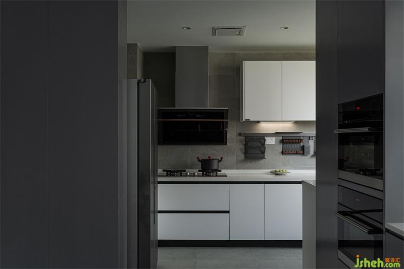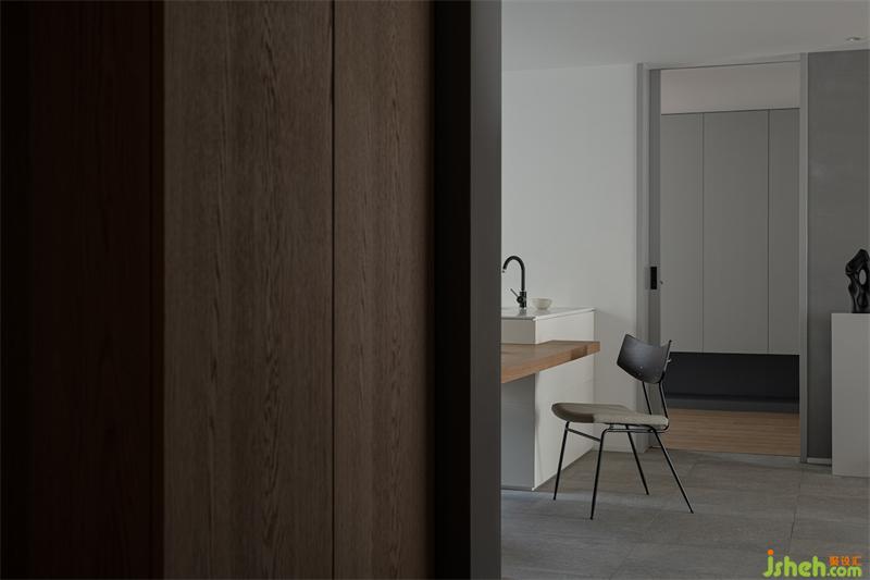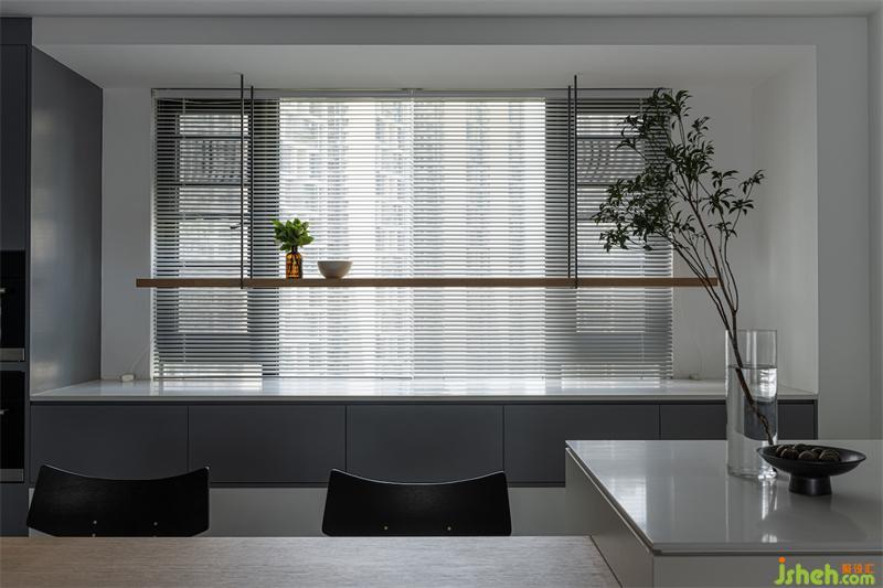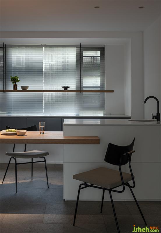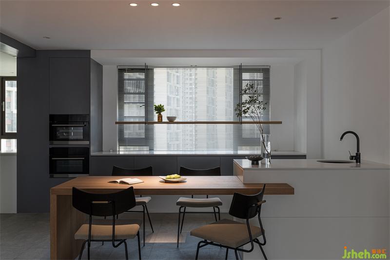 輕食區(qū)是定制的組合式島臺,成都黑白灰設計采用白色與原木色搭配,在開放又包容的空間,讓居住者之間擁有更好的互動體驗。