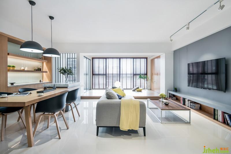 將客廳、餐廳、活動(dòng)區(qū)相整合,使各區(qū)域功能疊加使用,打造居家互動(dòng)生活動(dòng)線。落地窗下挑高的木質(zhì)地臺(tái)形成活動(dòng)休閑區(qū)域,讓屋主可享有最自由的居家形態(tài),增添生活中的趣味性!