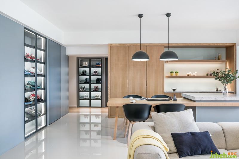 室內(nèi)設(shè)計(jì)師除了規(guī)劃廚房外,增加了大比例的輕食區(qū),結(jié)合中島臺(tái),讓屋主能享受下廚的樂趣同時(shí)也能與家人互動(dòng)。左側(cè)透明發(fā)光的球鞋展示柜,滿足了屋主大男孩的收藏愿望。