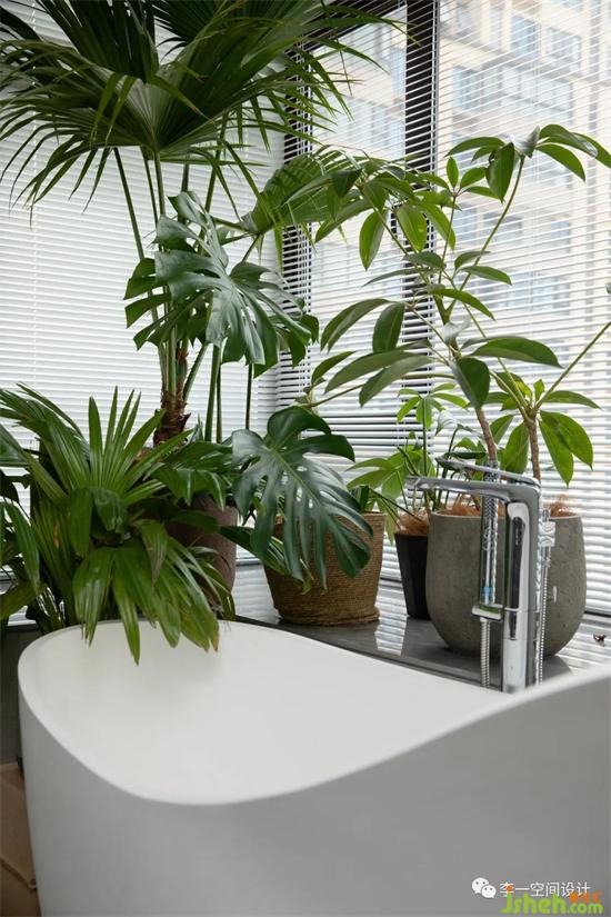 日升而起,日落而息,用橫軸劃分的左右分區(qū),將東面全部給了生活。盡最大尺度的飄窗臺給了主臥觀景的同時又保證了起居行為上的品質(zhì);進口床與床品建立了高品質(zhì)睡眠的裝修設計保障,充足的衣帽與收納給了一個干凈的家,溫暖的燈光緩亮,身躺森林系環(huán)境下的浴缸,這是一天完美的句號。
