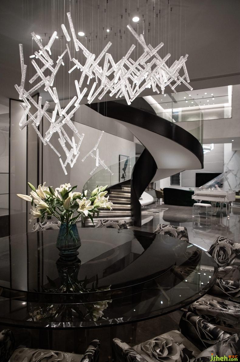客廳里的圓形樓梯猶如雕塑般的存在,是設(shè)計(jì)中的神來(lái)之筆。這個(gè)樓梯與其說(shuō)是功能需要,倒不如說(shuō)是精神需要。因?yàn)閺墓δ苌蟻?lái)說(shuō),從三層至二層可以有一個(gè)樓梯和電梯來(lái)通達(dá),實(shí)際上,這個(gè)圓形樓梯是專門(mén)為女主人設(shè)置的,它夠大夠氣派形態(tài)優(yōu)雅,成為客廳空間的核心,統(tǒng)領(lǐng)空間結(jié)構(gòu),有了它,客廳空間就有了一種力量與氣場(chǎng),有了靈魂。它,是對(duì)主人生命的贊美。我們希望,每一天早晨,女主人從這個(gè)圓形樓梯緩緩拾級(jí)而下,環(huán)顧高敞的客廳,有一種“女王”般的驕傲、優(yōu)雅、豪邁,胸懷壯闊,大愛(ài)無(wú)疆。