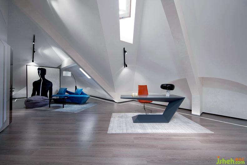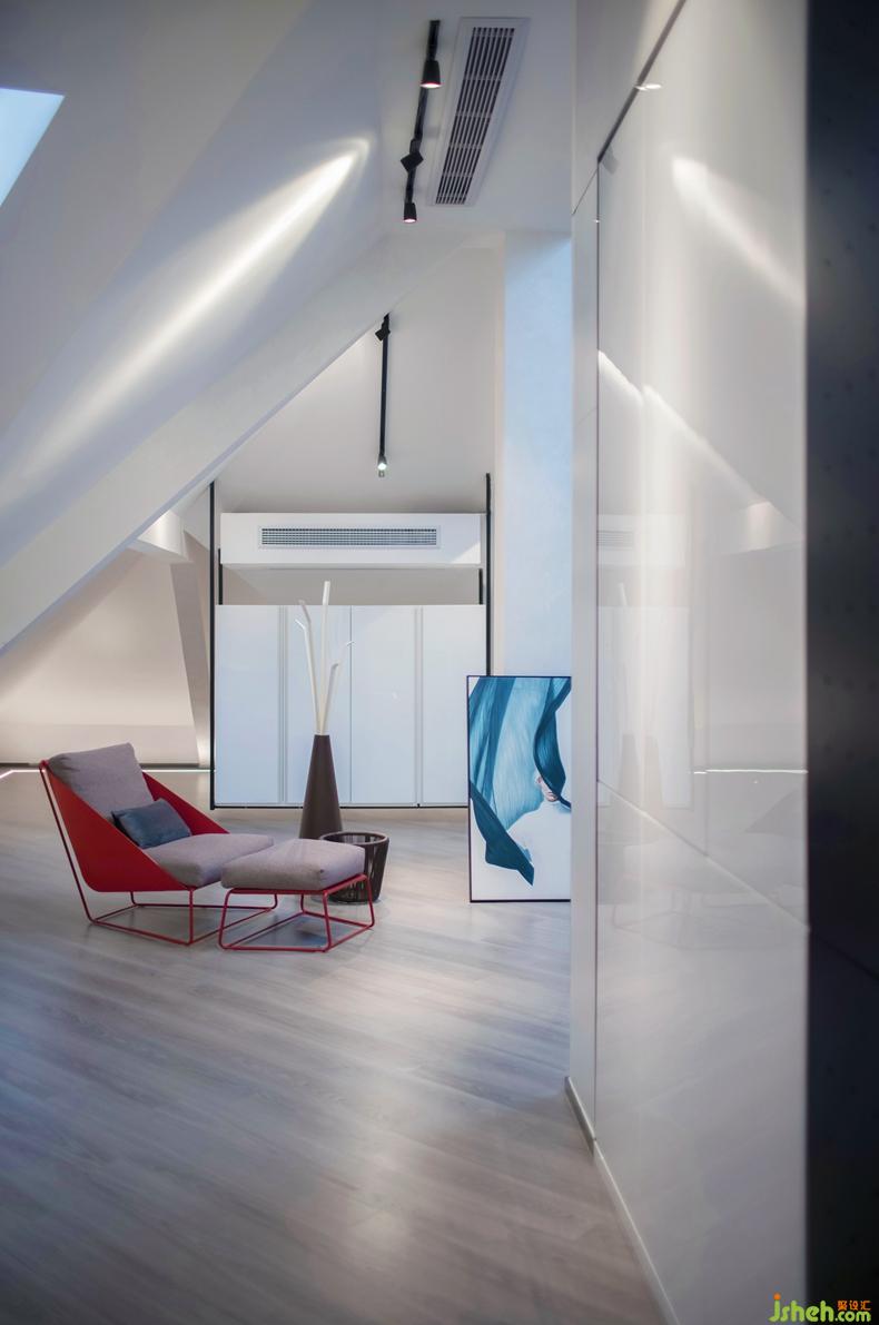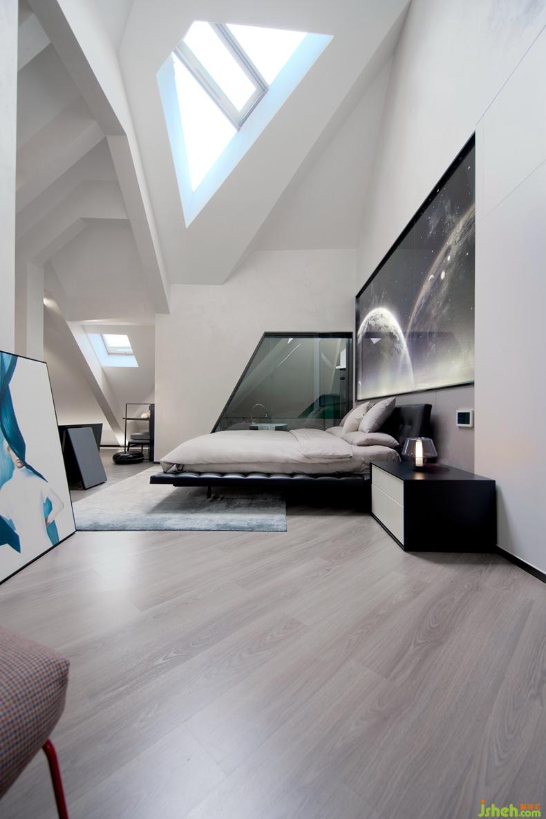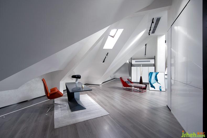 三層是主人臥室與兩個(gè)臥室。四層是閣樓,是大女兒的臥室,也是開放式的格局,由斜面的屋頂結(jié)構(gòu)所創(chuàng)造的空間感非常獨(dú)特,天窗的采光方式及地面往上的漫反射光增加了神秘浪漫的感覺,看書、寢臥、衛(wèi)浴、衣帽等功能同處一個(gè)開放的空間格局之中,自由、溫馨又有充滿個(gè)性。