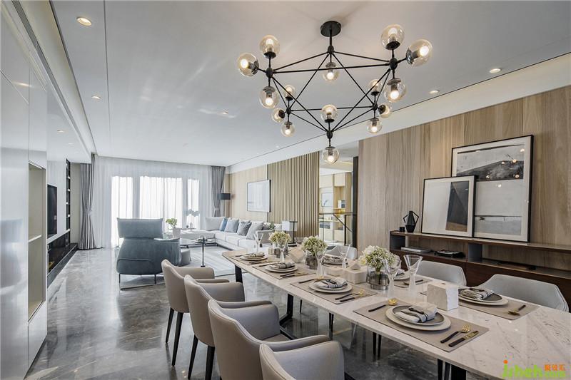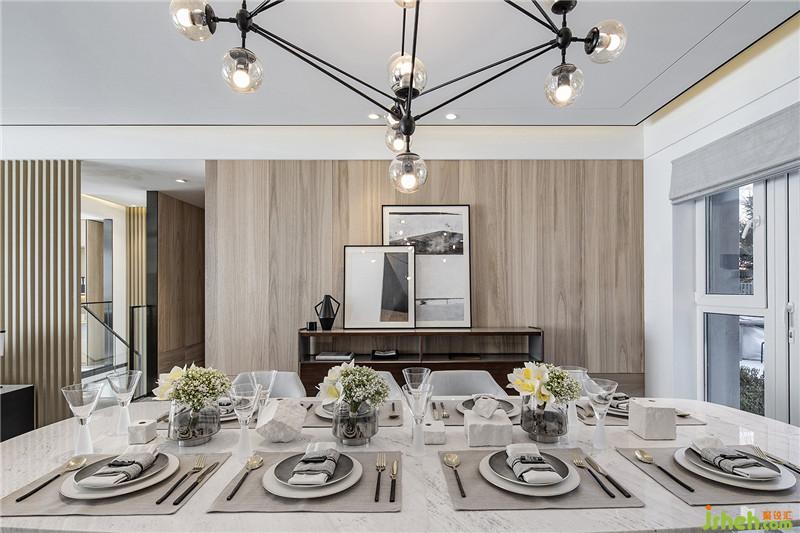 客餐廳,處于一層的中心位置,是互通的空間,一側(cè)是大面石材和純凈白色柜體,對立面是溫潤的木飾面背景,不同材質(zhì)的大塊面的關(guān)系豐富了空間的層次,視覺統(tǒng)一在明亮簡潔的色調(diào)中。