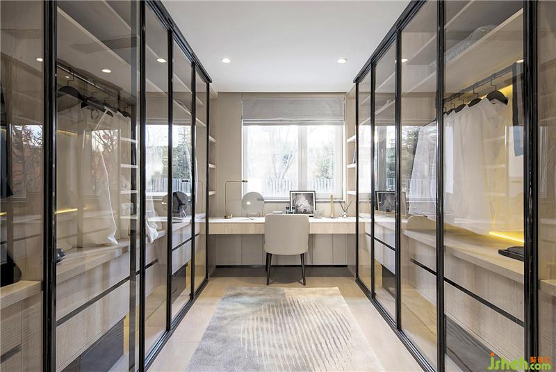 兩個(gè)套臥設(shè)置在一樓,原始的主臥衣帽間被做了擴(kuò)展,雙面衣柜和梳妝臺的置入,變成了更大氣的步入式衣帽間。
