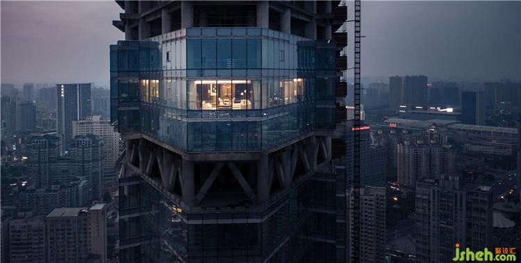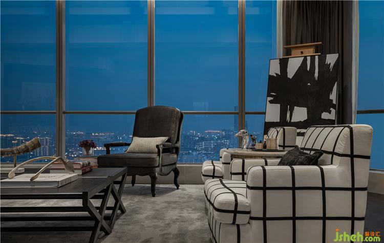公共空間的家具選型與陳列方式以會(huì)客廳的形式展現(xiàn),圍合的沙發(fā)與單椅構(gòu)成具有場景感的交流空間。建筑立面玻璃幕墻,270°城市景觀,在城市地標(biāo)中心,享有天際線的廣闊景致,獨(dú)屬的城市景觀。