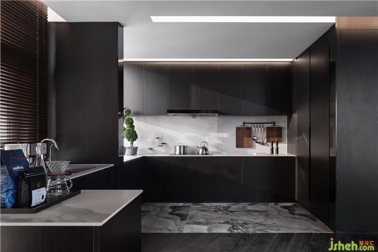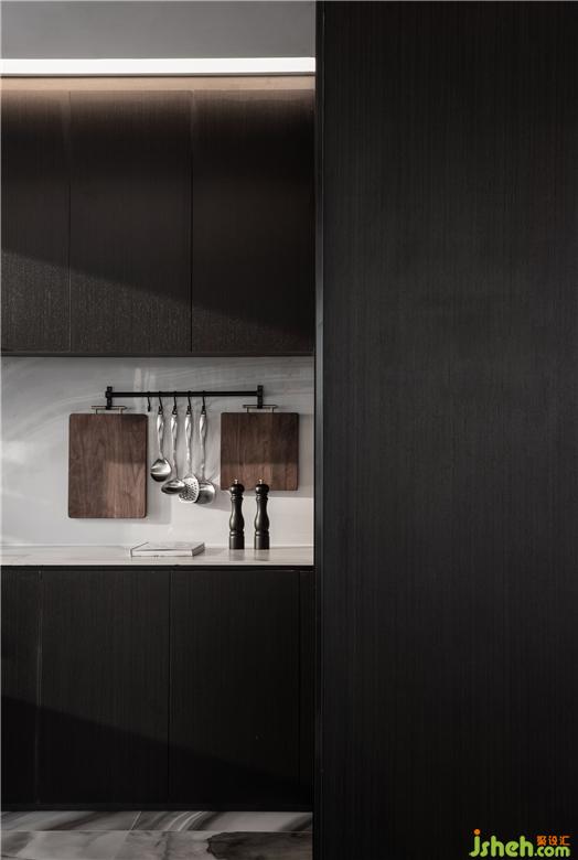 空間界面深灰色木地板、黑色木飾面,與白色的沙發(fā)形成對比,樣板房設(shè)計游弋于黑白之間的金屬色與深木色,是對黑白藝術(shù)的平衡。
