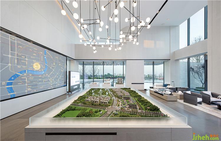 沙盤區(qū)背景墻黑色的幾何體塊與上方的線型燈飾構(gòu)成厚重與輕盈的對(duì)比。
