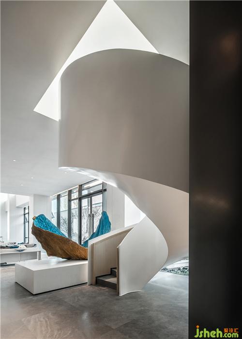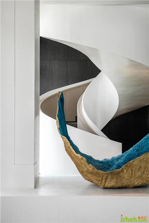旋轉(zhuǎn)樓梯與藝術(shù)裝置是舞動(dòng)的“精靈”,造型和線條展現(xiàn)力量與靈動(dòng)。藝術(shù)品為空間的空白填補(bǔ)想象,在具象與抽象之間,傳遞價(jià)值。