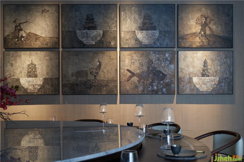 自由是人的天性,也是現(xiàn)代設(shè)計(jì)的靈魂。設(shè)計(jì)的筆墨自由地穿梭于新舊之間,在宴會(huì)廳中以一組現(xiàn)代藝術(shù)家歸榮彪的油畫藝術(shù)《古影似夢(mèng)》,呈現(xiàn)渭南的皮影文化——懷舊、古樸的色彩,似夢(mèng)似幻的寫意,斑駁迷離地展示著傳統(tǒng)文化的特殊魅力。新時(shí)代的油畫語言,賦予這一古老文化新的解構(gòu)與詮釋,既為空間增添了幾分場(chǎng)域記憶濃度,也引發(fā)觀者的各種冥思和遐想。