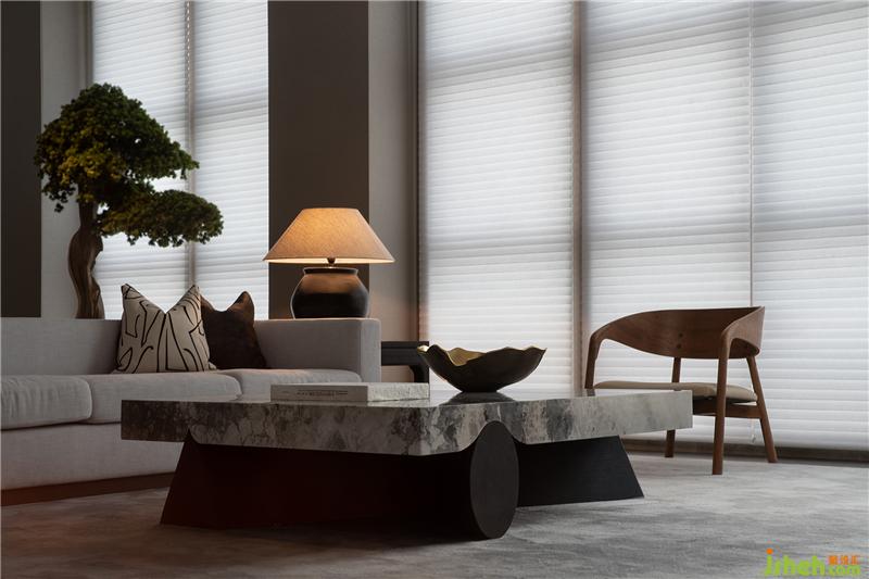 會(huì)客區(qū)整體以米白為基調(diào),點(diǎn)綴深淺相搭的原木色澤、氣質(zhì)高雅的大理石桌,對(duì)稱掛墻的書法作品與一旁蓬勃蓊郁的古松,為空間添增文人儒雅的氣質(zhì),充分塑造了一個(gè)具有格調(diào)與品質(zhì)感的會(huì)客空間。