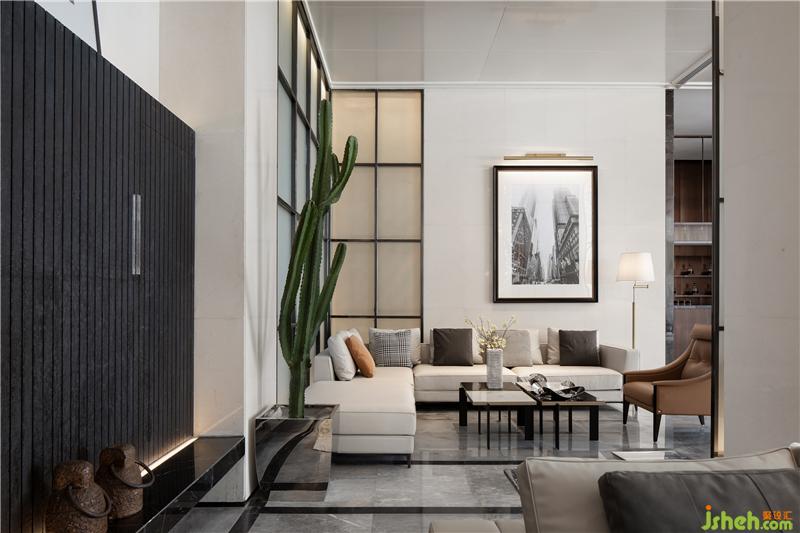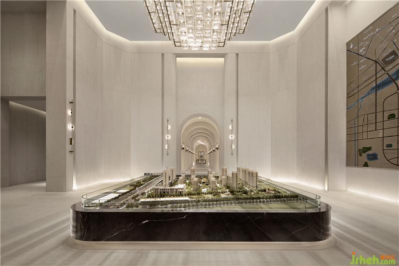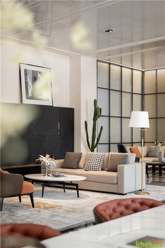 售樓處設(shè)計在規(guī)整的室內(nèi)結(jié)構(gòu)中,于門框兩側(cè)以墨色大理石加強(qiáng)了視效對比,為空間變換打造獨(dú)具一格的視覺享受,宛如營構(gòu)了一幅框景,框中正是洽談空間明媚優(yōu)雅的光景。