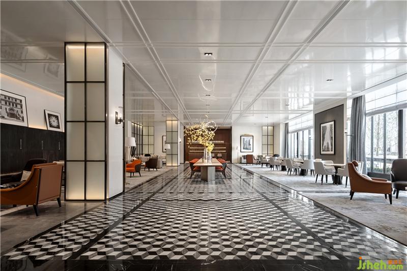 高挑的空間中,天花吊頂、四面墻體均以菱形線條演繹雕塑感,璀璨的藝術(shù)吊燈以序列感構(gòu)建起壯闊與大氣,材質(zhì)以輕盈的玻璃磚與墻面硬包形成對比,打造硬朗過渡到柔性的視覺印象,盡顯典雅潔凈。