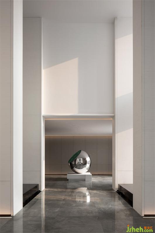 建筑是悠長蜿蜒的弧形動線,室內(nèi)廊道如同一幅靜靜攤開待閱的長卷。營銷中心設(shè)計(jì)師引用經(jīng)典的中軸對稱,一張一合,一進(jìn)一景的鋪陳手法,去創(chuàng)造高低錯(cuò)落的節(jié)奏和空間序列。