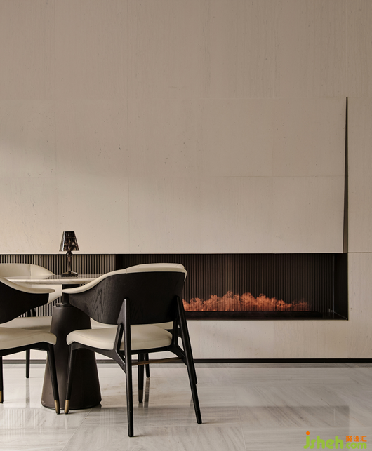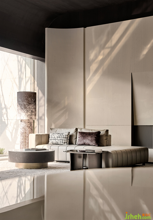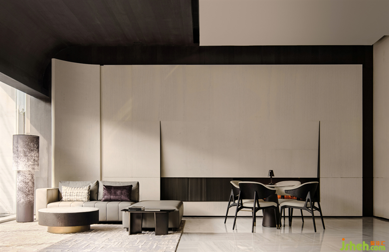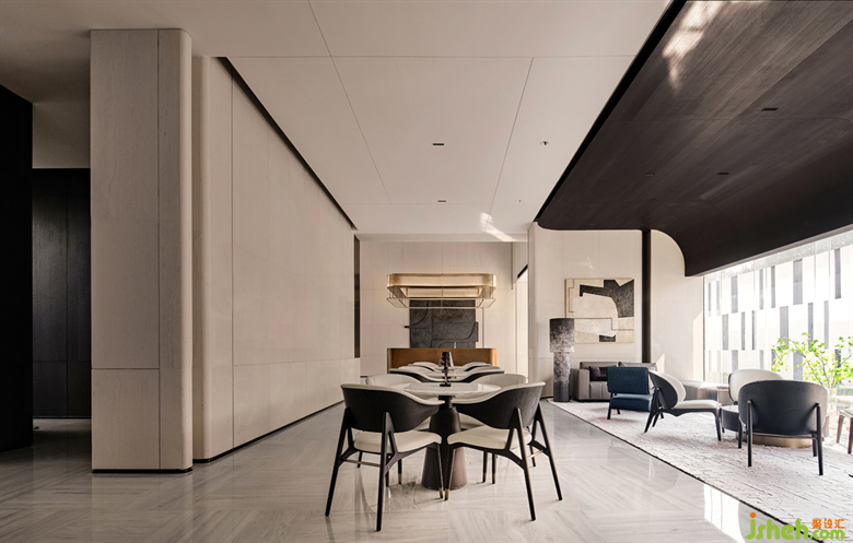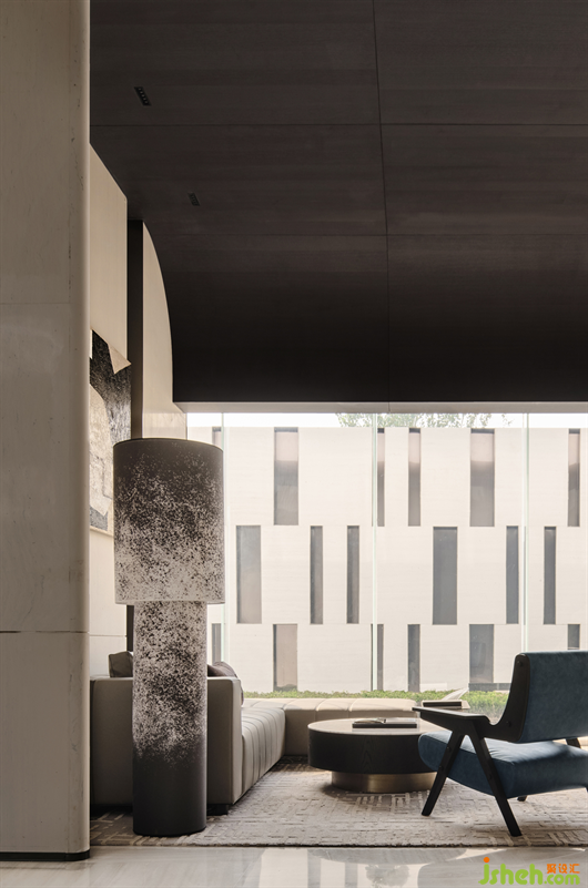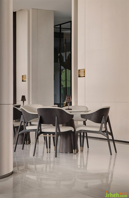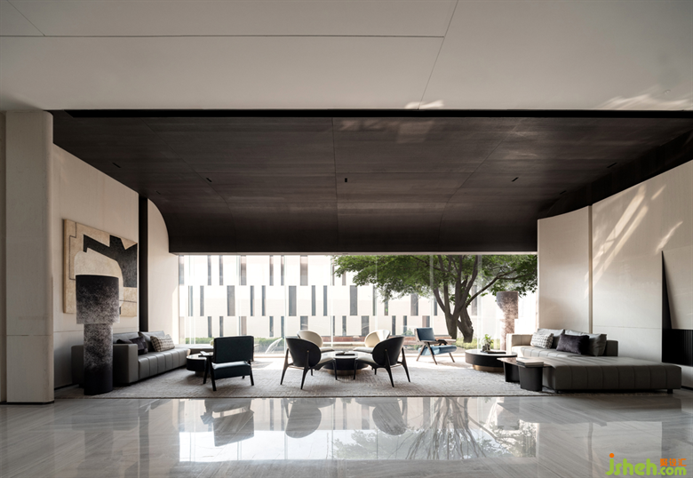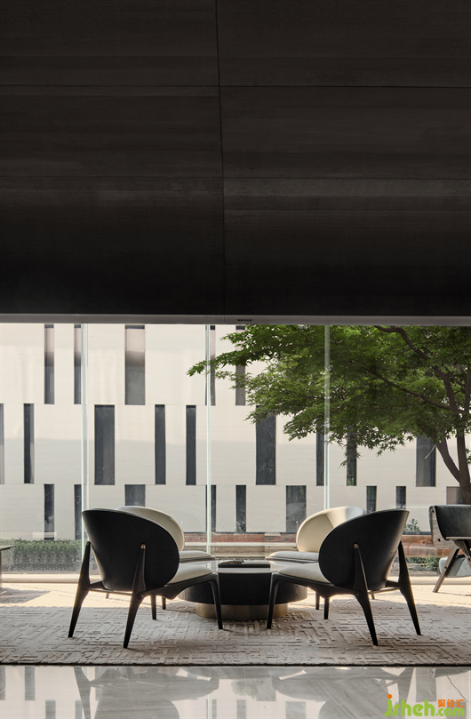 剪水盈波,樹影搖曳,為了讓人們的視線能聚集于身旁的景致,洽談區(qū)的界面設(shè)計暗藏了巧思。