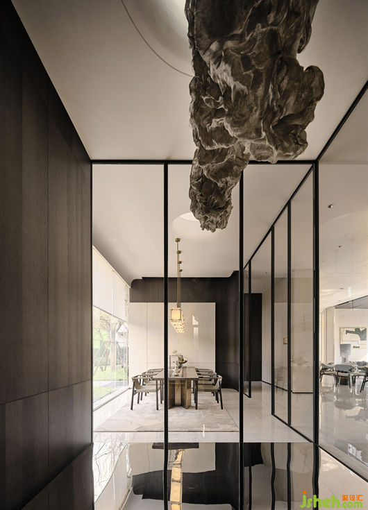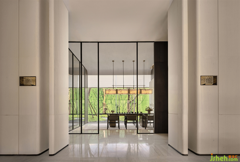 我們從金陵景色挖掘線索,將梧桐樹形與藝術(shù)材料結(jié)合演繹,造一個(gè)純景觀空間。若視線從洽談區(qū)穿過,也可成為過渡景觀,豐富空間層次。