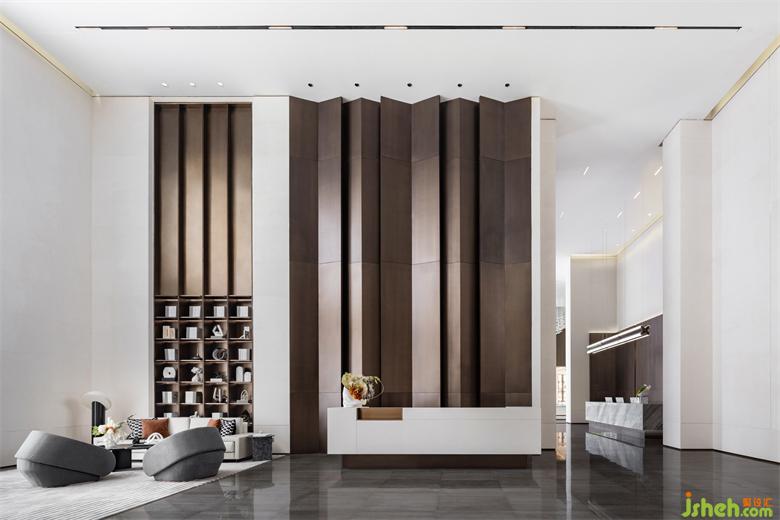 歸家大堂,溫潤的淺色石材、沉穩(wěn)的深色地面石材圍合出大尺度空間,背景用藝術(shù)化處理的古銅材質(zhì),豎向折面呼應(yīng)其建筑外觀。