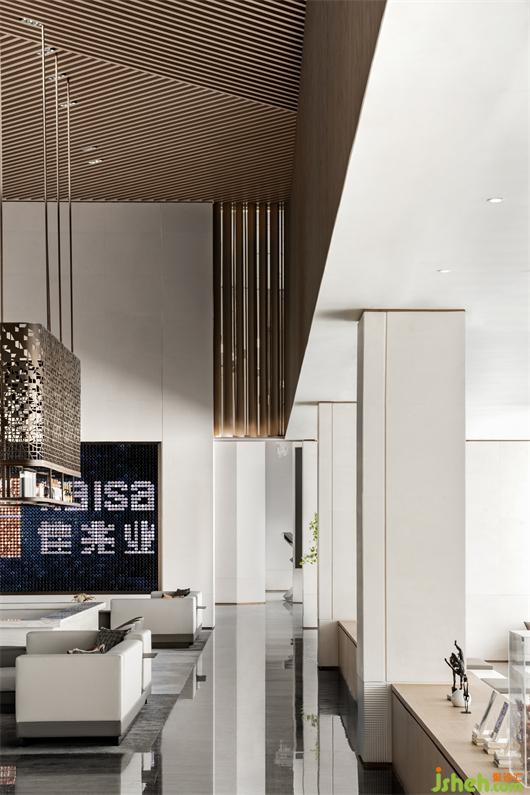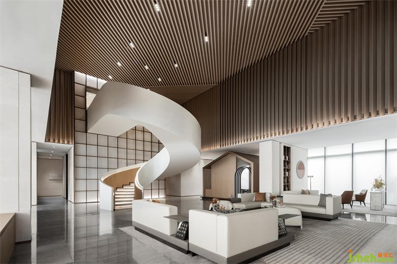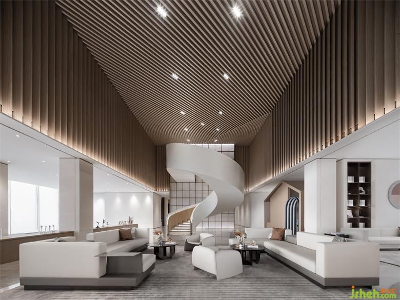 公共洽談區(qū)頂部造型設計靈感源于沈陽中國工業(yè)博物館的外立面,博物館建筑以鋼鐵等金屬材料塑造硬朗大氣的外觀,我們將建筑造型的特色提煉為室內設計的語匯,營銷中心設計使用溫潤的木材朝不同角度有序列的順延,生成有強烈造型感的空間結構。在視覺上更為簡約大方,且增強了與人的親近感。