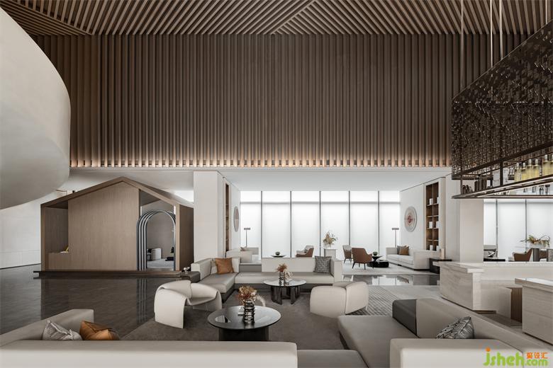 中部的洽談區(qū)布局以酒店大堂吧的形式圍合陳列,以恰到好處的距離感,確保人們在交流時擁有舒適的尺度。