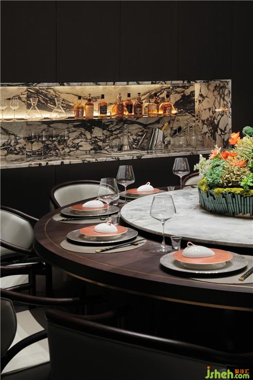 水吧背后采用玻璃材料延伸空間視覺(jué),別墅裝飾玻璃、鏡面不銹鋼結(jié)合燈光形成了光影的明暗,消除了封閉空間的束縛感。