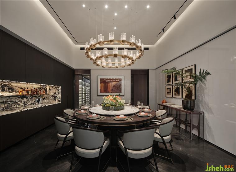實(shí)木的圓形餐桌,精致的餐具擺盤,有器全而成席的儀式感,別墅裝飾素雅的空間色調(diào)在藝術(shù)掛畫(huà)和綠植的襯托下,帶給了家宴廳禮序、尊貴、安靜平和的氛圍。