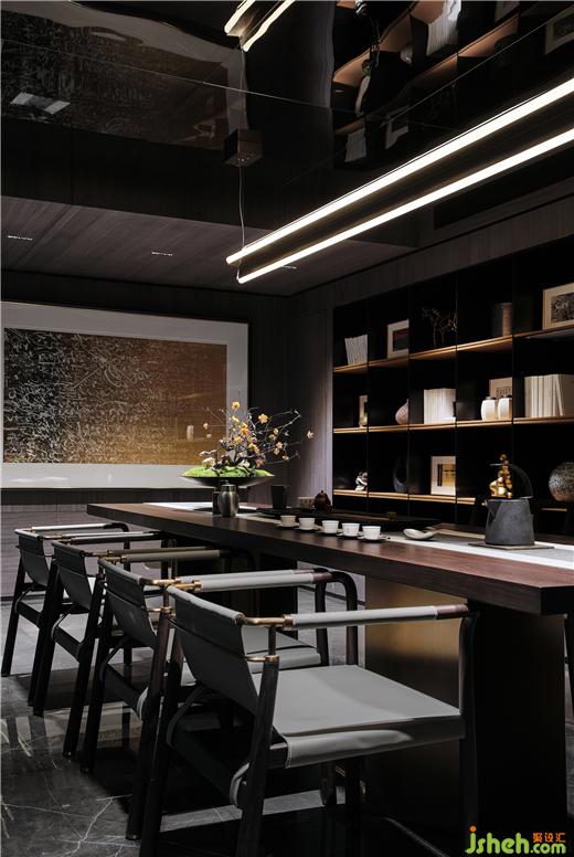 別墅裝飾設(shè)計(jì)師利用夾層的空間增加了一個(gè)茶室。飲茶、書(shū)法,偏居一隅,簡(jiǎn)而不凡,縱使外面車馬喧囂,歸家如入安靜桃源。