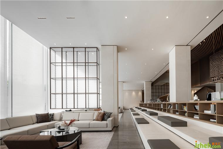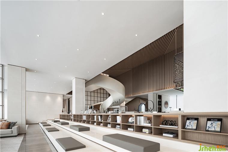 營銷中心設計師利用層高的落差順勢設計成階梯書吧,豐富了空間體驗層次,書柜上擺放著書籍和文化藝術品,讓場景展開更多交互,營造放松的場所氛圍。