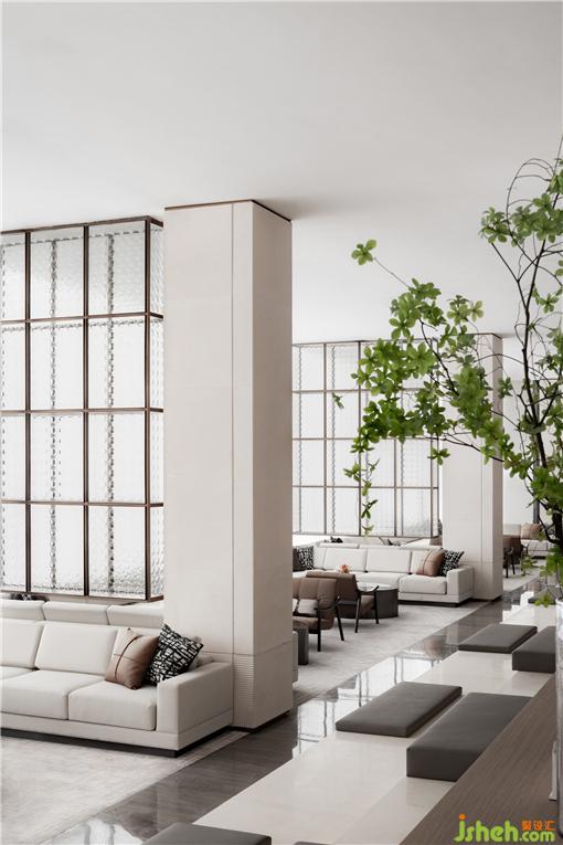 每一方沙發(fā)卡座之間以藝術玻璃盒子作為隔斷,光影與玻璃形成交錯之感,朦朧了空間界限。與中心部分的公共空間相比,這里尺度感和包圍感更強,營造舒適愜意的交流氛圍。