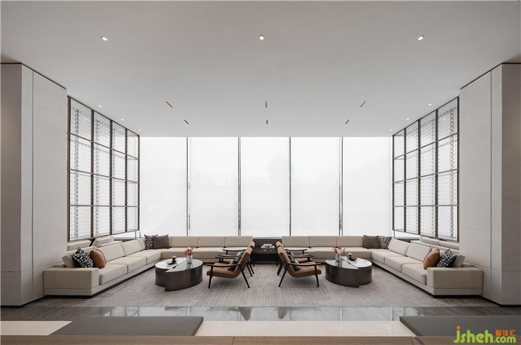 臨窗洽談區(qū),營銷中心設計師創(chuàng)造性地采取了下沉式設計,與建筑造型及景觀設計和諧共融。從外看,該區(qū)域完全融入了水景之中;從內(nèi)看,視野與光感俱佳,與戶外景觀零距離。