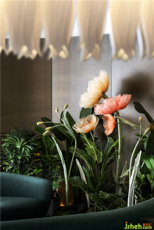 植物藝術裝置,將自然界隨處可見的苔蘚與花材等復合材料結(jié)合,售樓中心設計將森林山谷中的萬物共生的寓意縮影于此,增強空間的生命力與氣場。