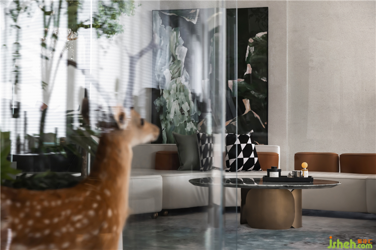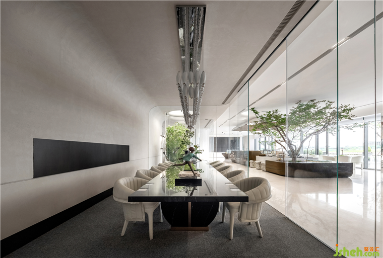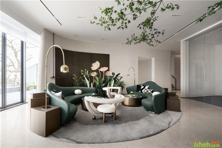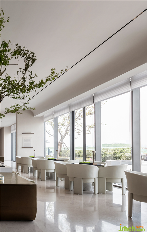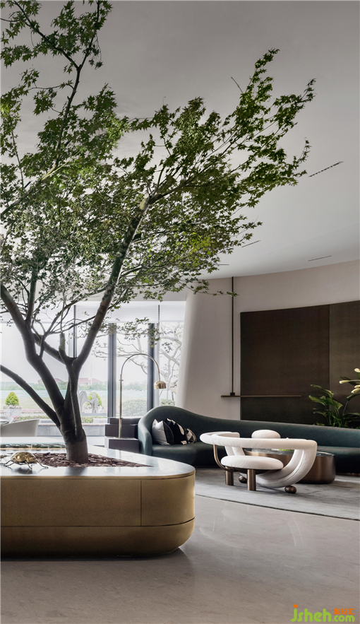 一棵綠色的樹長在室內(nèi)成為耀眼的存在,它強化了空間以自然為核心的主題,售樓中心設計給環(huán)境帶來了生機。
