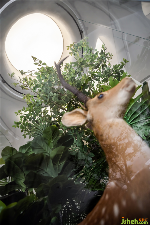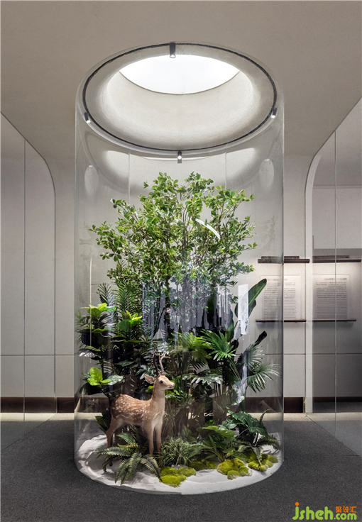 多功能空間與VIP室的過渡區(qū),添置了一處森林景觀區(qū),我們通過人為的天光的營造把景觀區(qū)作為一個吸睛的設計點,售樓中心設計將情境主題推到一個高點。