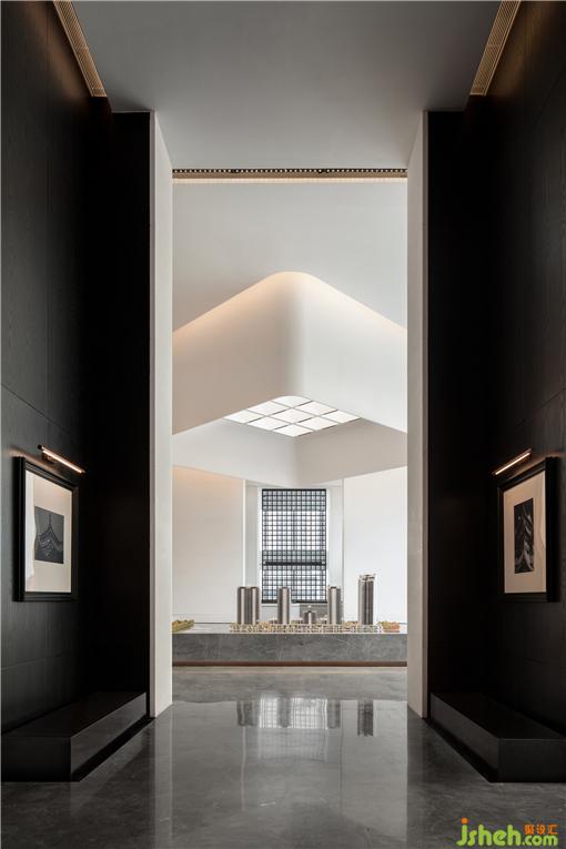 建筑是悠長蜿蜒的弧形動線,室內(nèi)廊道如同一幅靜靜攤開待閱的長卷。營銷中心設(shè)計師引用經(jīng)典的中軸對稱,一張一合,一進一景的鋪陳手法,去創(chuàng)造高低錯落的節(jié)奏和空間序列。