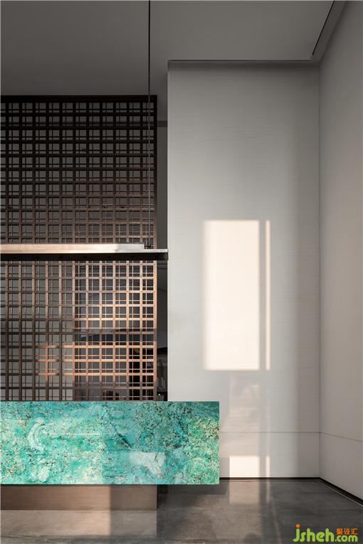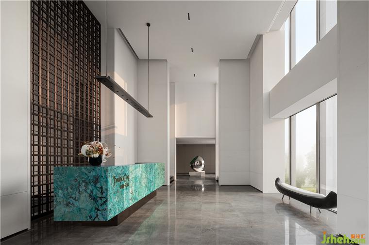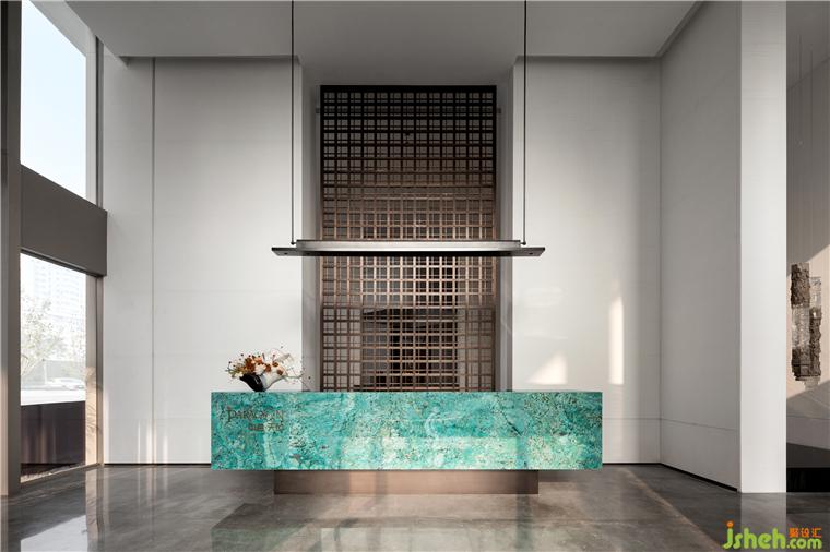 接待廳,我們特意尋覓了孔雀藍色彩的奢石,營銷中心設(shè)計精細打磨圍合出一方細膩且高雅的接待臺,形成視覺的第一會面空間。