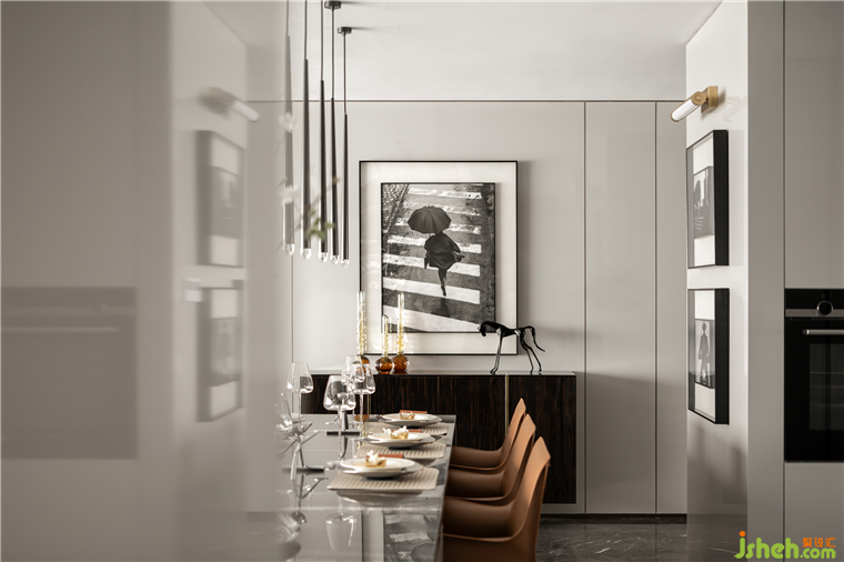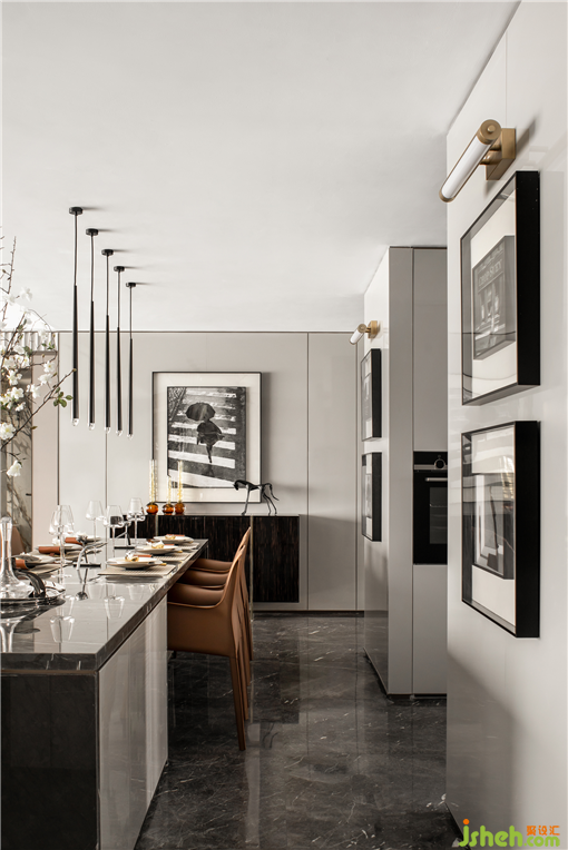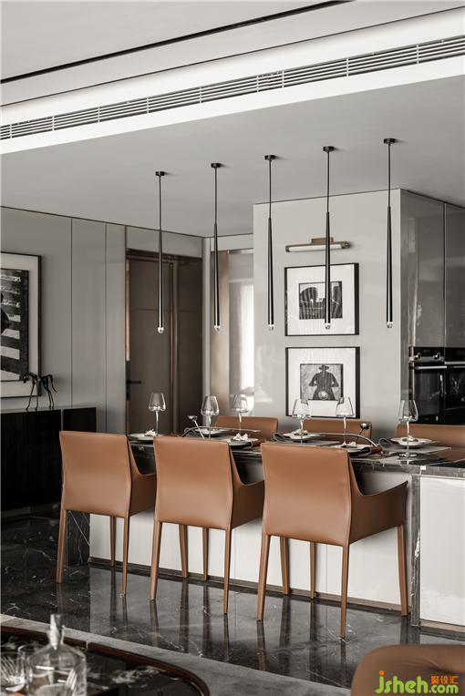 樣板房設(shè)計3.6米的多功能餐吧是該戶型不同于常規(guī)家庭設(shè)計的一大特點,長桌的利用率增強,它不僅是日常的餐桌,也可以當(dāng)工作臺,游戲、手工、烘焙等都可在這里進行,利于家庭成員間的交流活動。