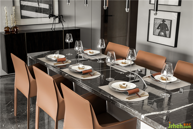 大理石餐桌搭配皮質(zhì)餐椅體現(xiàn)空間的品質(zhì)感,再搭配裝飾吊燈,增加空間的品質(zhì)感。