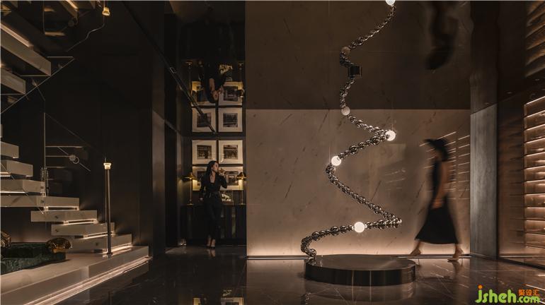 一層入口,以耀眼奪目的珠寶展示區(qū)作為第一體驗(yàn)區(qū),鑒賞珠寶臻品的藝術(shù)魅力。中海寰宇天下會(huì)館設(shè)計(jì)定制的藝術(shù)屏風(fēng)與深色皮革材料,鋪就沉穩(wěn)隱奢的氣氛,熠熠閃亮的燈飾與陳設(shè)品,詮釋了空間的獨(dú)特之處。