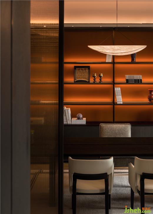 書房是開放姿態(tài),橙色的展示柜體,與軟飾家具成深淺關(guān)系,中和韻律,凸顯時尚經(jīng)典品位。