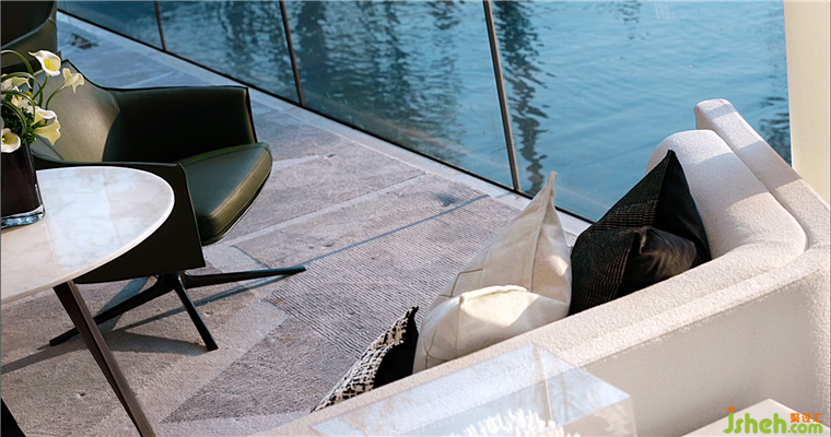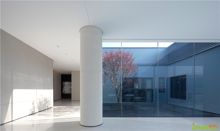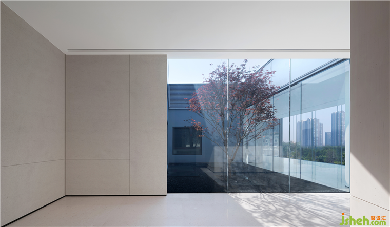 戶外水景主要集中在西側(cè),西側(cè)的過渡空間是全玻璃材質(zhì),有了水景的加持,令室內(nèi)感到通透和開敞。