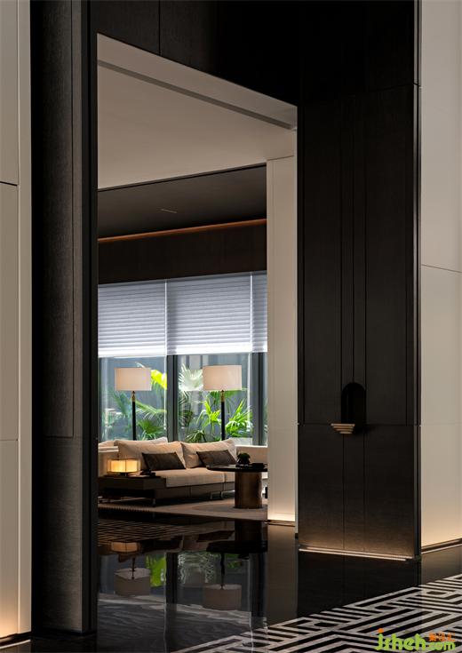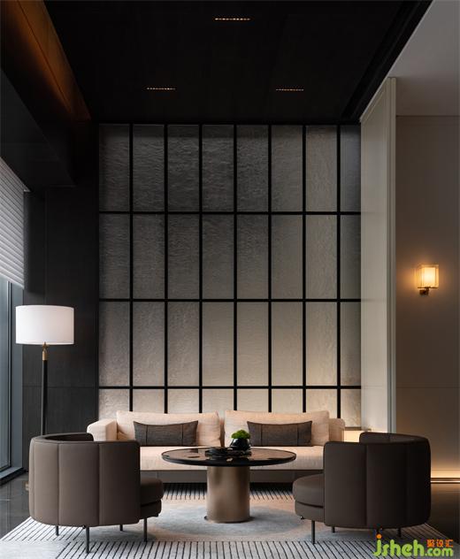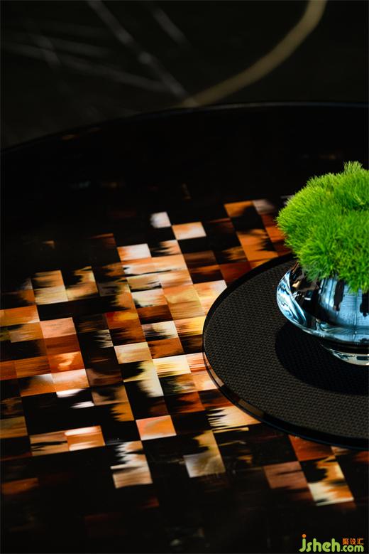 柔和的焦糖色光芒,將藝術玻璃的朦朧、拼花石材地板的復古韻味以及古銅與深色木飾面的肌理,準個凸顯和描繪。