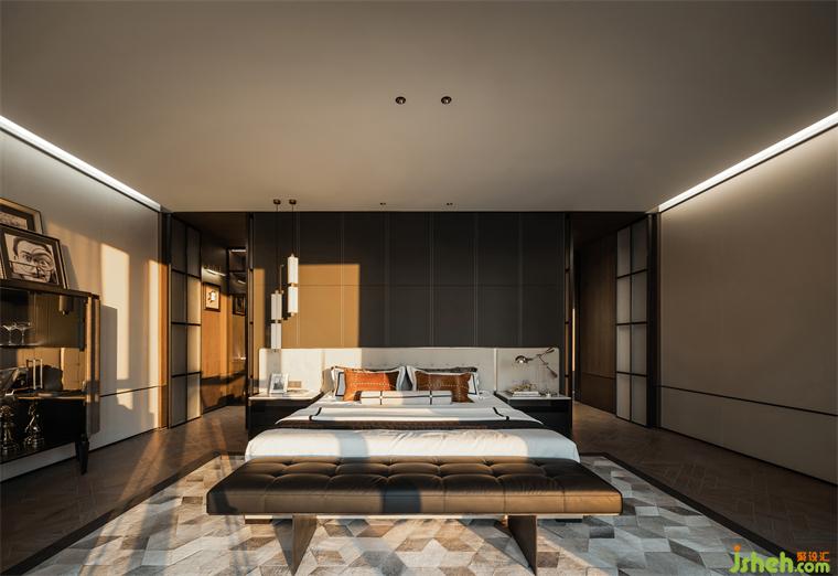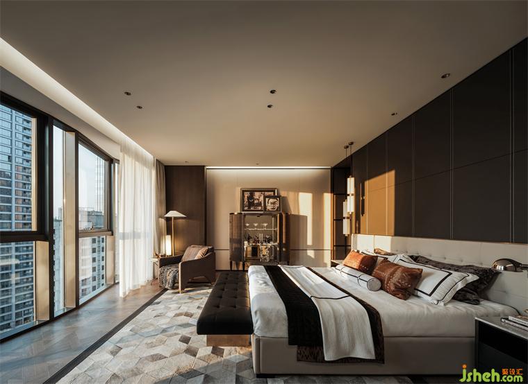 樣板房設計利用奢闊的尺度將臥室布局為三段遞進式的分區(qū),床對景而立居中擺放,與衣帽間形成洄游動線。